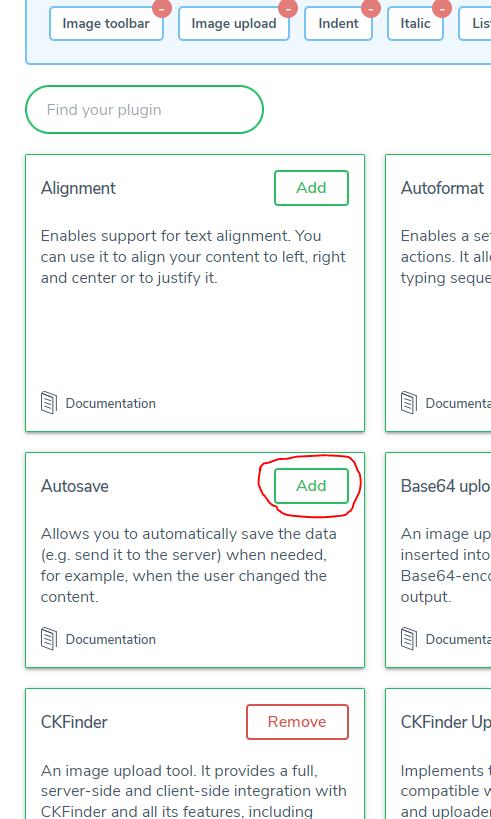 The autosave feature is not included in any of the CKEditor packages by default, so we will need to generate a custom build of CKEditor. Go to https://ckeditor.com/ckeditor-5/online-builder/ and choose your preferred editor style. When you get to the “Choose editor plugins” step, make sure you click Add on Autosave.