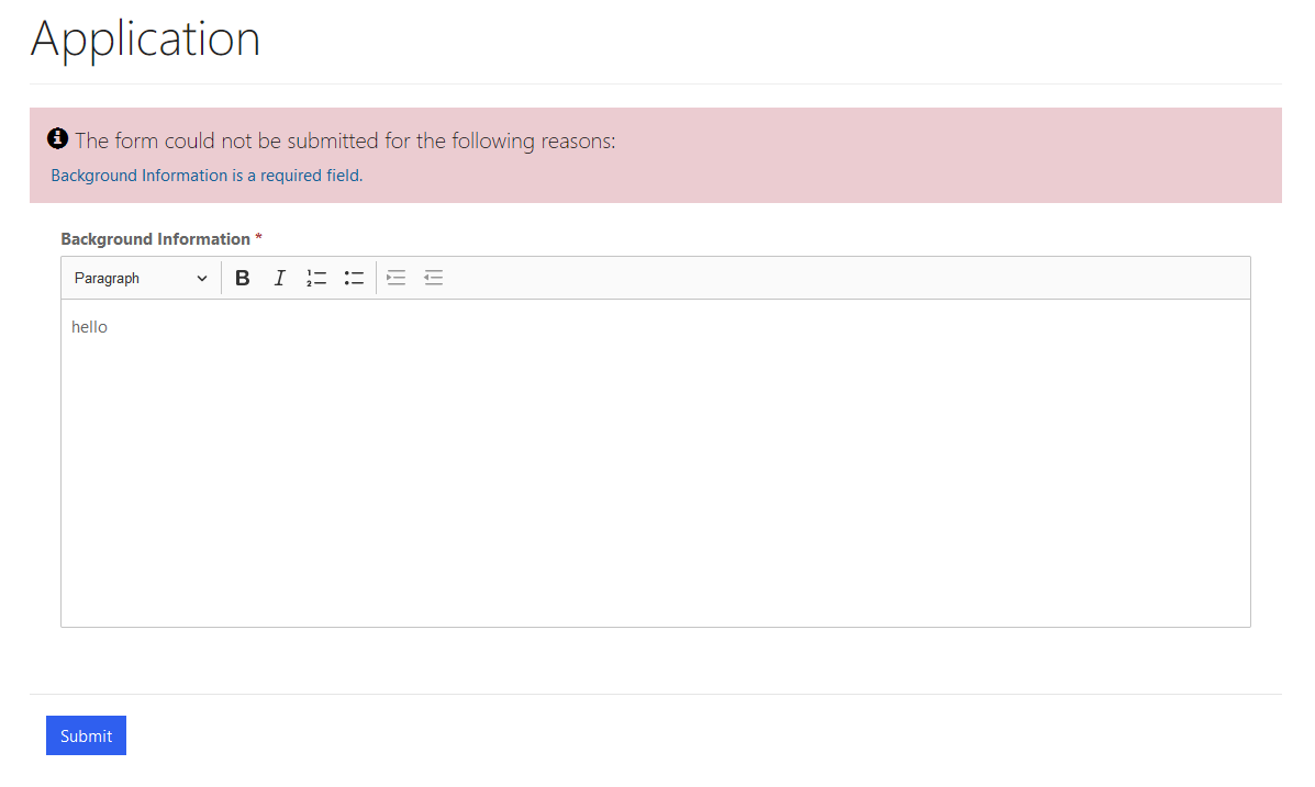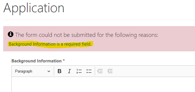 There is actually one more issue with CKEditor on the Portal. OOTB, you can click on a validation error message (highlighted in the screenshot below), and the page will scroll to the offending field and that field will receive the focus.