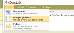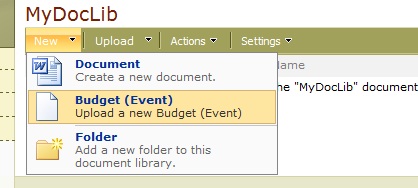 There is another twist: for a document library, if a content type is visible, but it’s document template is blank – you will get an option to upload, rather than to create new, under the New menu (as shown below).