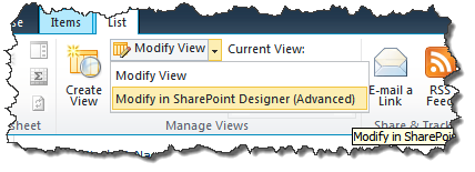 Now go to the list using the browser and go to the Highlighted View. On the ribbon, click on the List tab under the List Tools group. Choose to Modify view in SharePoint Designer as shown below: