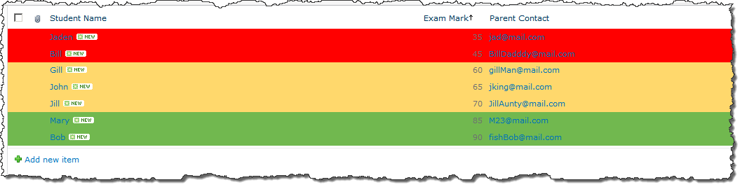 Say I have a list of students and exam marks. I want to create a view that highlights the students that are doing good and those that are not doing so well. The end product could look like the below, with rows highlighted red where the mark is less than or equal 50, yellow when the mark is between 51 and 74, and green when the mark is 75 or more.
