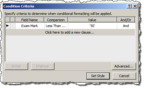 The Condition Criteria dialog box should appear. This is where you specify the condition that a style will be applied to. In the Field Name dropdown box select Exam Mark. In the Comparision dropdown box select Less Than or Equal. In Value type in 50. Your dialog box should look like the below: