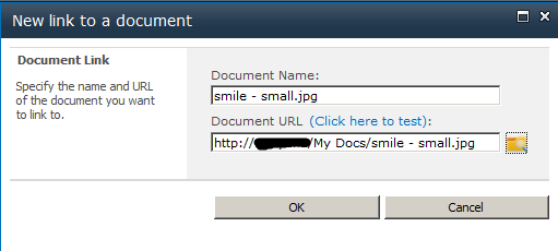 The URL and descriptive text of the document selected by the user is passed to the JavaScript above as the first 2 arguments. Essentially in this function we retrieve the URL and Name text boxes of the create a Link to a Document form by their client ID, and then set their value to the URL and descriptive text provided to us by the AssetUrlSelector.