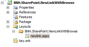 Create a new empty SharePoint project (mine is called BNH.SharePoint.NewLinkWithBrowse) and specify it to be farm solution. Add a SharePoint “Layouts” Mapped Folder to the project. Right click on the sub-folder underneath the Layouts folder and choose to add an Existing Item…. Browse to C:\Program Files\Common Files\Microsoft Shared\Web Server Extensions\14\TEMPLATE\LAYOUTS and select the Newlink.aspx file. This will add a copy of the NewLink.aspx file to our solution. Your solution should now look like this: