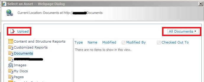 - The Upload button that allows the user to directly upload a document to a location, then create a link to it