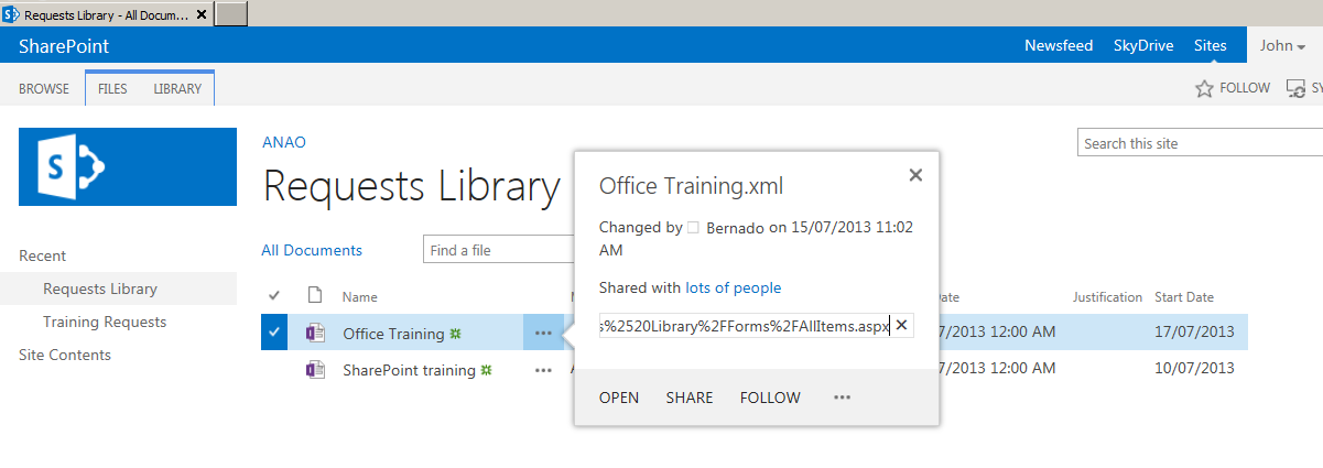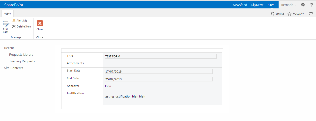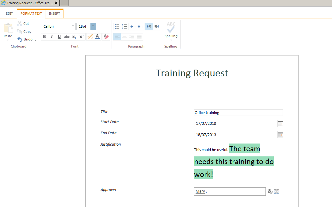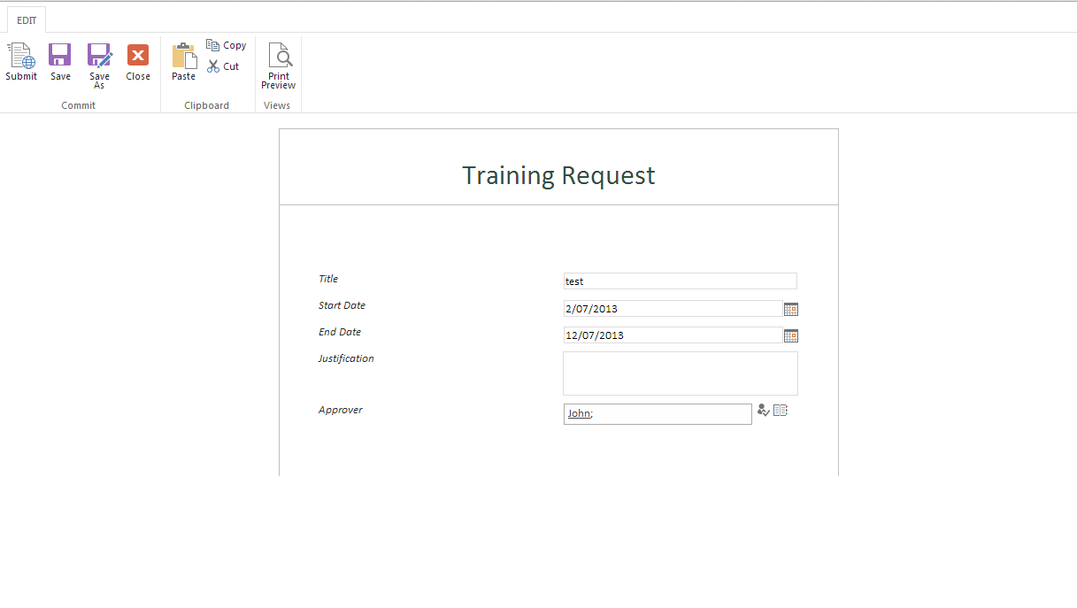 Below I have clicked the item link to open the form. This form actually opens in edit mode and I, as the read-only user, can make changes to all fields. I edited the text in the Justification field.