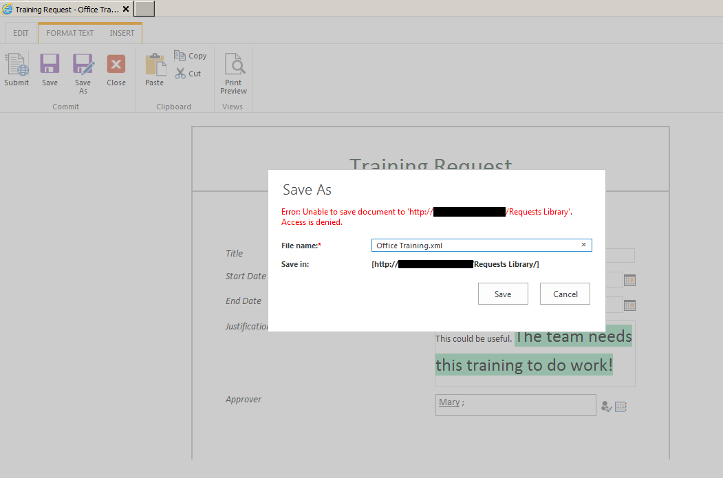 Form Library allows read-only users to edit the form. Only when the user attempts to save the changes, does the Form Library reports an access denied error. This is quite a poor user experience. This is illustrated in the screenshots below.