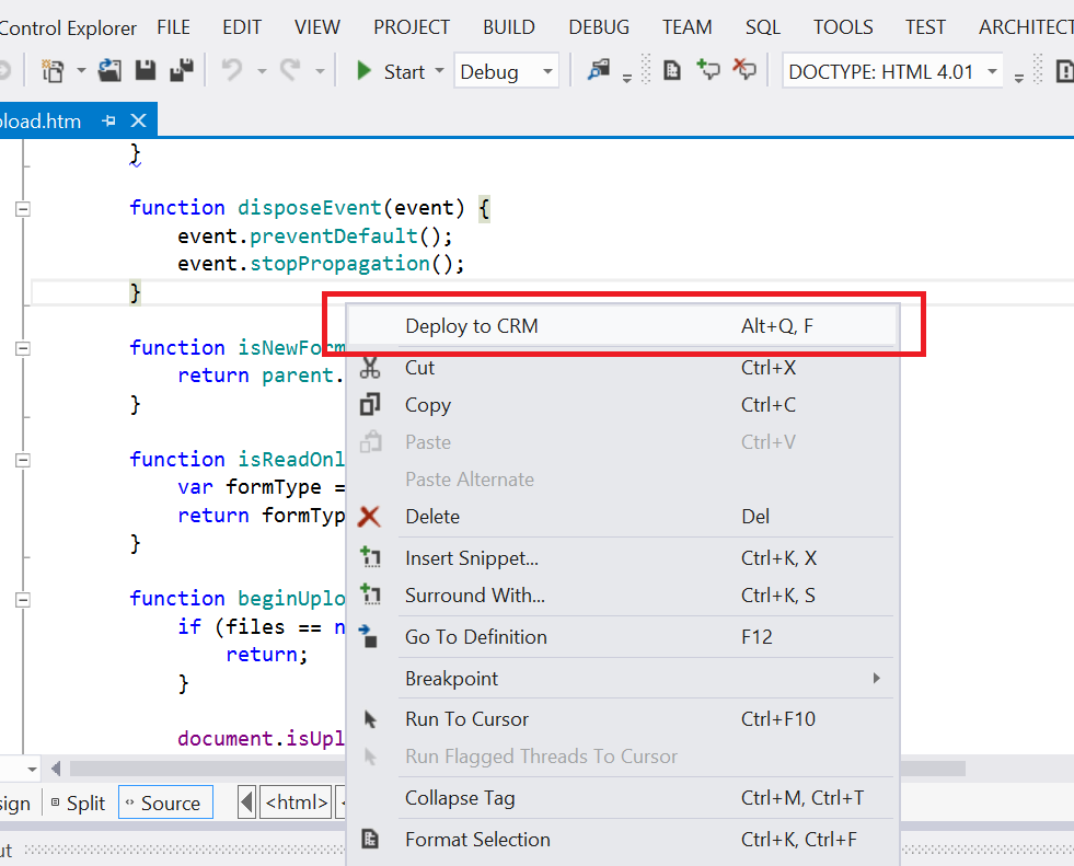 Note that this command will only be enabled and appear in the editor context menu for files that are recognised as deployable web resources. This means the file must be located under the WebResources folder of the project, and must be one of the web resource types (e.g. JavaScript, CSS, HTML, XML, etc).