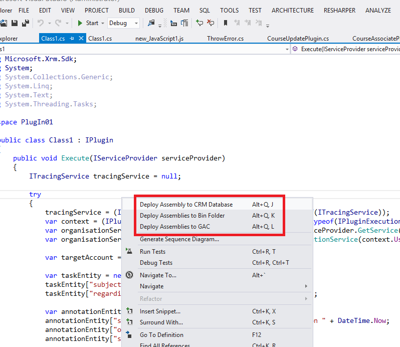 CRMQuickDeploy 2.7 now has shortcut keys that enable you to deploy the “current” project’s assembly to CRM. “Current project” here means the project of the code file that is currently active in Visual Studio’s code editor.