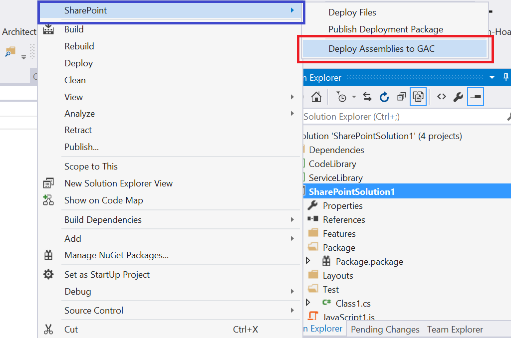 - Right-click on a project and choose Deploy Assemblies to GAC (under the SharePoint group).