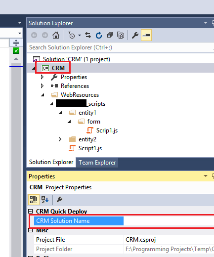 A new property has been added for project nodes in the Solution Explorer, namely CRM Solution Name:
