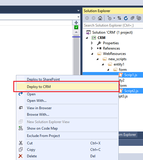 It is now possible to right-click multiple files and folders in the Solution Explorer and click the Deploy to CRM command from the context menu to trigger deployment for the selected items.