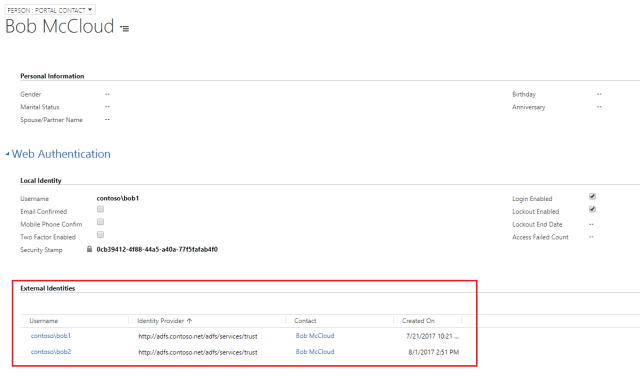 In Adxstudio Portal you can associated multiple external identities to a single contact record in CRM. For whatever reason let say contact Bob McCloud has two ADFS accounts with your organisation, contoso\bob1 and contoso\bob2. You can configure it so that regardless of which account is used to login with, the user context is resolved to Bob McCloud.
