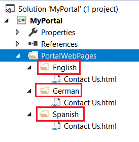 Under this approach, English\Contact Us.html for example would be deployed to the Contact Us web page where the language of that page is set to English. Note that only the immediate parent of the VS project item is used to determine the target language.