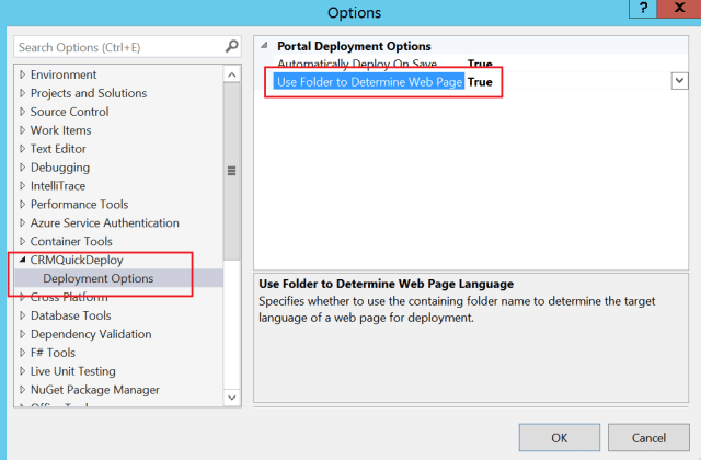 To prevent this new approach from breaking your current project structure, this new feature of web page language targeting must first be enabled in Visual Studio. You can do this by going to Tools \ Options \ CRMQuickDeploy \ Deployment Options and set Use Folder to Determine Web Page Language to True.