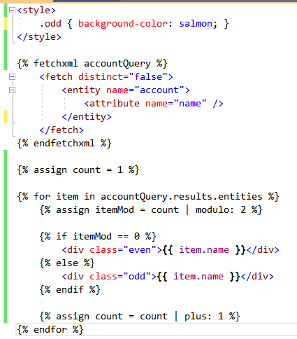 In most cases I think you’d want to use the {%- -%} syntax to keep your HTML clean and compact. To illustrate the point, let say I have the code below to list all the accounts, with a different CSS class for odd and even items.