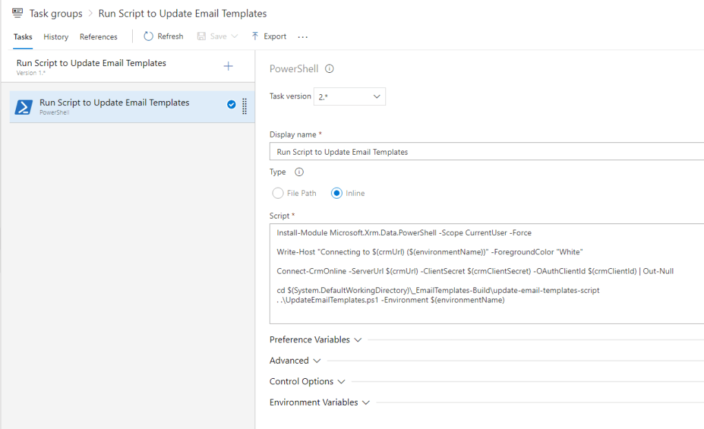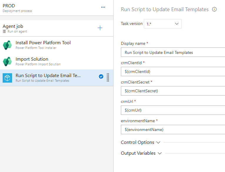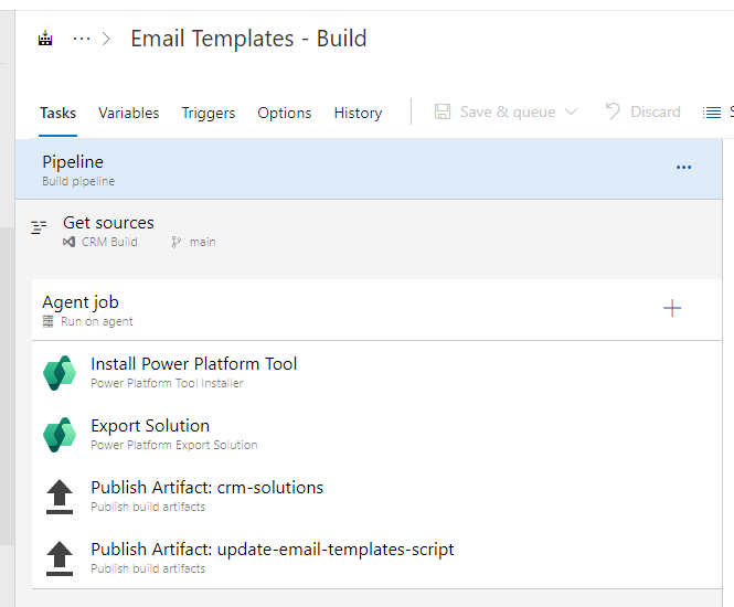 This pipeline simply exports the CRM solution containing the email templates and publishes that as an artefact. It also publishes a second artefact, which is our script to update the email templates post deployment. Note that the script expects the config file to be in the same location as the script. You therefore should place the script and the config file in the same folder in the repo and publish that folder as an artefact.