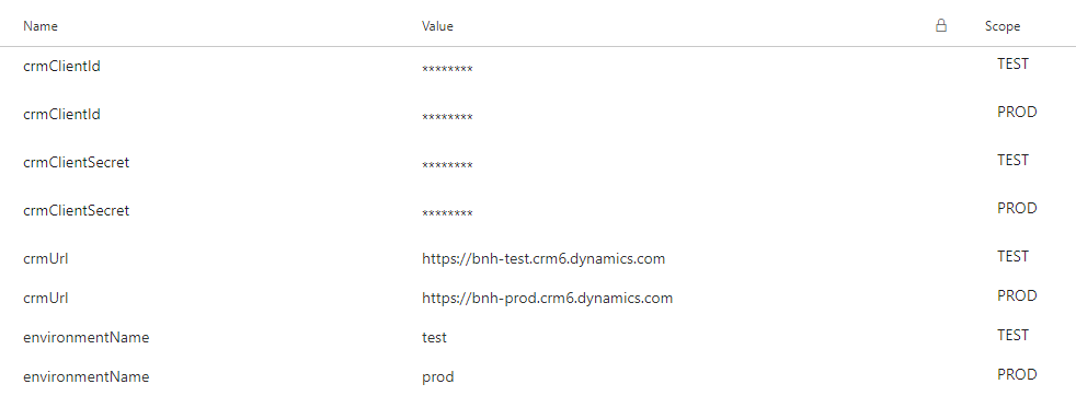 crmClientId, crmClientSecret and crmUrl are used to make connection to the target CRM. environmentName should be one of the environments identified in our config file.
