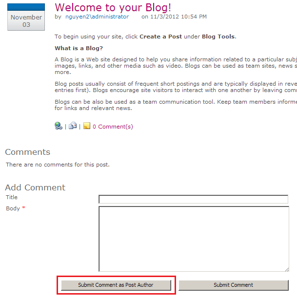 | Posting blog comments as original author of blog post in SharePoint 2010 | For SharePoint 2010. A simple and elegant solution that allows admin users to post comments to blog articles as the original author of the blog post. |