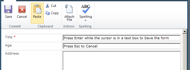 | Adding Enter and ESC default keys to SharePoint list forms | For SharePoint 2010. A simple and elegant solution that allows users to use the Enter key when creating/editing list items to save and close the form, and the ESC key to close the form without saving. |